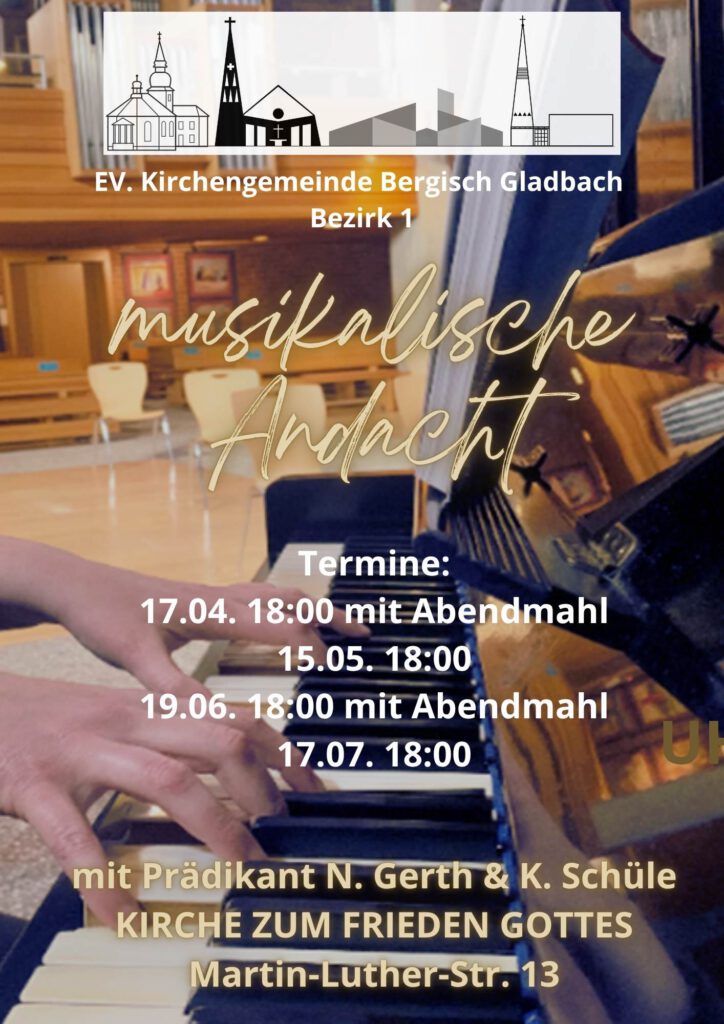 Unter der Leitung von Prädikant Norbert Gerth und begleitet von Katharina Schüle am Klavier entsteht eine ruhige und entspannte Atmosphäre, die dazu einlädt, die Woche besinnlich ausklingen zu lassen. Jeder ist herzlich willkommen. Wir singen Lieder aus dem Buch “Lieder zwischen Himmel und Erde”, lauschen den Worten des Psalms und hören eine kleine Ansprache zu einem Text aus der Bibel.